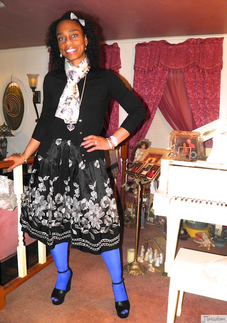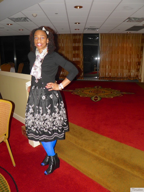 I get questions often on what to wear to occasions like this one. I love to dress up, however I like to be comfortable yet chic at the same time. I wore black and white which can be typical. However, I kicked it up a notch by adding a contrasting of color in my tights.