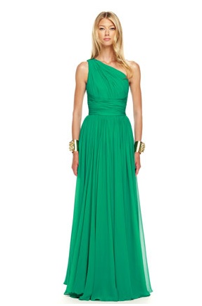 This Michael Kors ruched one shoulder silk gown is a show stopper. All eyes would be on the First Lady, the color of this gown is the pantone color of the year. This gown is so figure flattering because it would show Mrs. Obama’s fit arms and would cinch her in at the waist and then the dress would flow so romantically. The amulets on each arm of the model is to chic however Mrs. Obama could wear a tahitian pearl necklace and wear her hair up in a chignon or high bun.