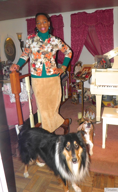 JT in Isaac Mizrahi cardigan and Macy’s turtleneck and Dialogue suede skirt